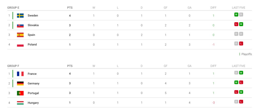 Today is the final Group Stage match day for Groups E and F. Spain has work to do to qualify and Hungary could still advance, which would knock out one of Germany or Portugal, however unlikely.