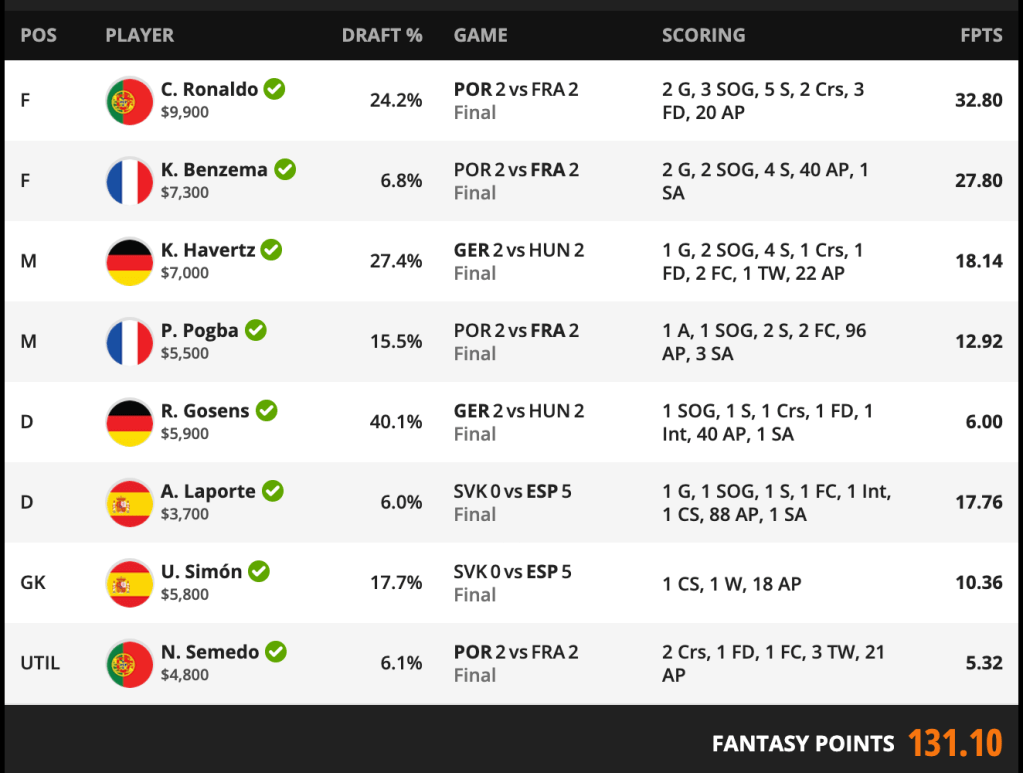 Every position must be filled, and kept under a salary of $50,000 total (more on this below). This makes it challenging to draft both Ronaldo and Lewandowski together, for example, as they have the two highest salaries available. You will notice some players’ position is M/F, so you can draft them into either position. Every outfield player can be selected as the Utility position; Goalkeepers can not.