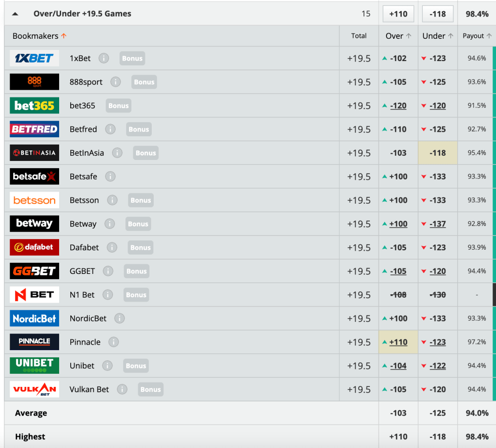 Over on the super convenient website Odds Portal, you can view a bunch of sports books’ lines all at once. I try to find a total that has juice one way or the other and it’s just a few clicks to compare different lines. Here is what I saw when I picked de Minaur: