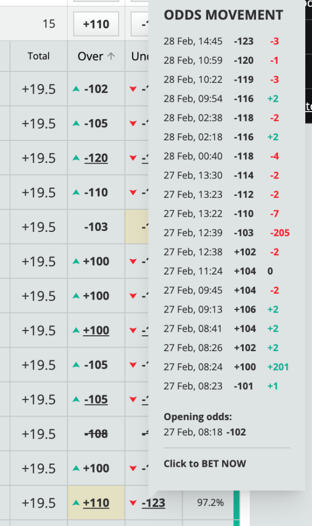 As you can see, Under 19.5 games had opening odds of -102 and now -123 at Pinnacle. And nearly every line is juiced to the under. Combine this with de Minaur being a massive -1200 or longer favorite, and we have a selection in my book.